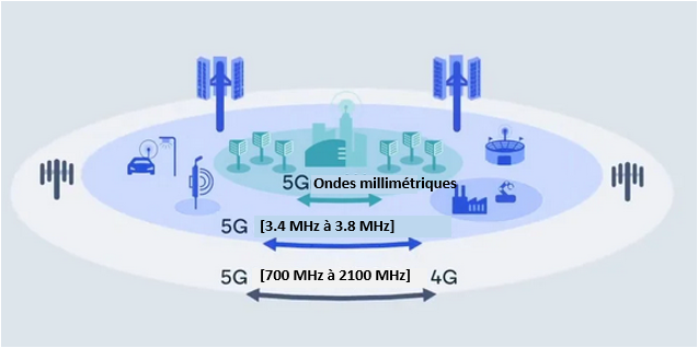 La 5G exploite en partie la 4G (LTE-Advanced) telles que certaines bandes de fréquences radio 700 MHz et 2100 MHz. En dehors des bandes de fréquences de la 4G, la technologie 5G possède ses propres fréquences : les bandes Super Hautes Fréquences SHF (Super High Frequency de 3 à 30 GHz) et les bandes Extra Hautes Fréquences EHF (Extra High Freqency de 30 à 300 GHz). Ces fréquences extrèmes utilisent les ondes radio millimétriques (0.1 à 1 mm) qui réduisent considérablement considérablement la perte du signal et permettent des transmissions rapides des données avec des débits très élevés pouvant aller jusqu’à 10 Gbits/s.